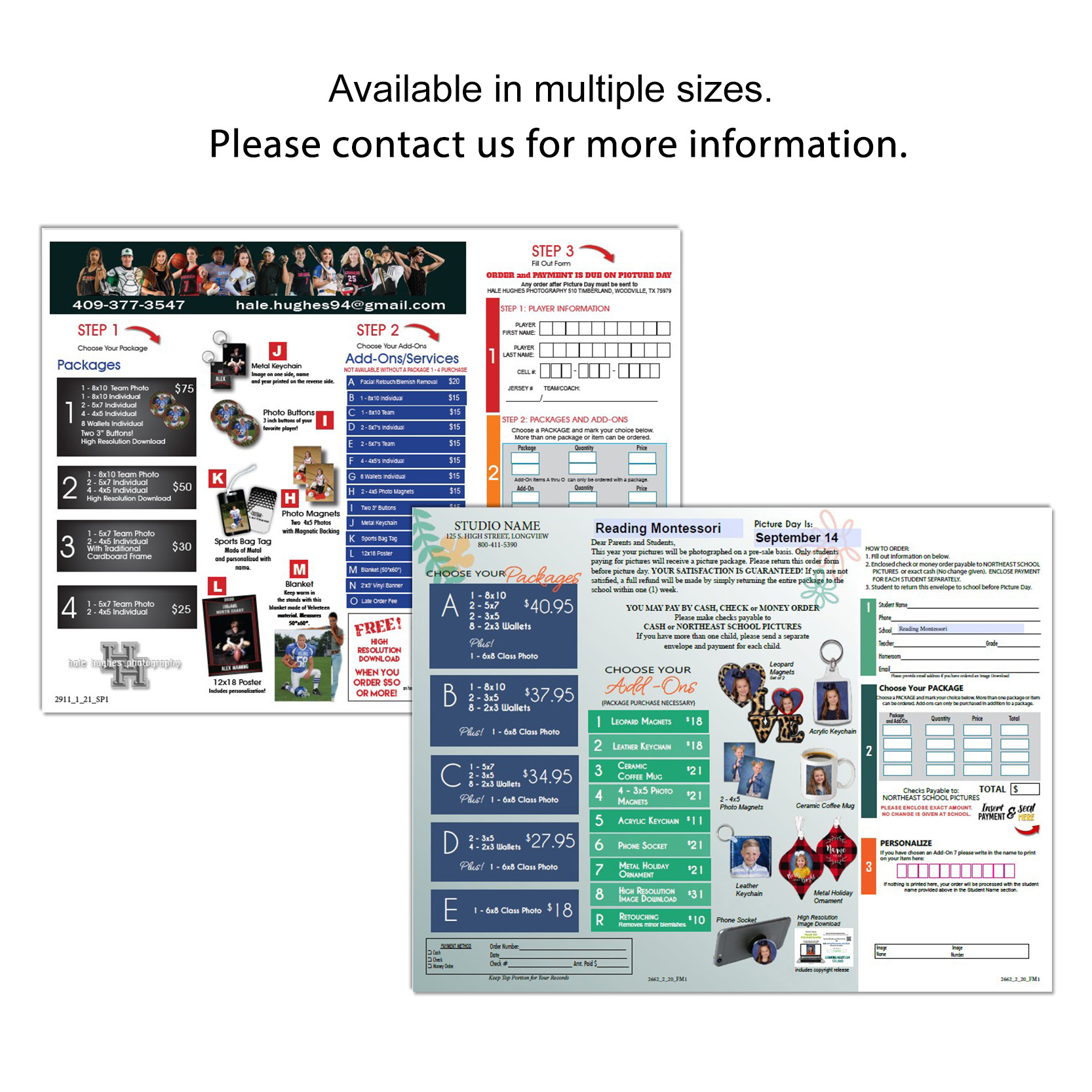 The prepay envelope serves as a marketing tool and order form, combining package offerings and convenience. It allows parents to see your package and add-on options before deciding which items best fits their needs and budget. We have several sizes to choose from and each includes a tear off portion of the envelope for ordering purposes. Prices start at .32 each.