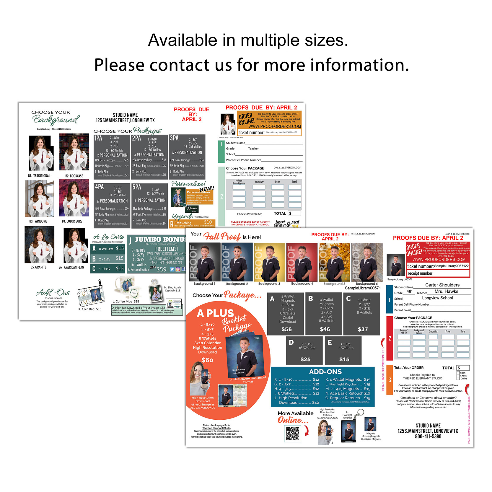 The proof envelope serves as both a preview and order form, combining marketing and convenience. It allows parents to see their child’s portrait before deciding which package best fits their needs and budget. We have several sizes to choose from and each includes a tear off portion of the envelope for ordering purposes. Prices start at .49 each. Contact the lab to get your envelope started.
